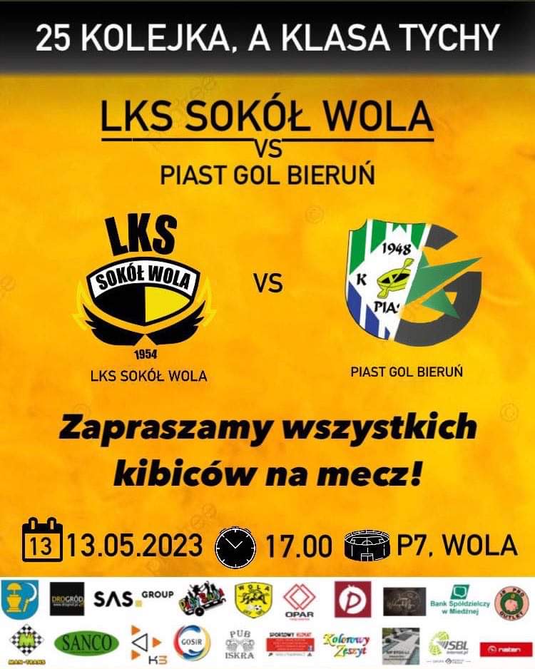 W najbliższą sobotę podejmujemy przy Pszczyńskiej 7 lidera rozgrywek zespół BAP Piast Gol Bieruń. Drużyna gości pewnym krokiem zmierza do Klasy Okręgowej i w zasadzie w najbliższym meczu może przypięczętować awans wygrywając w Woli. Sokół nie zamierza jednak tanio skóry sprzedać więc liczymy na ciekawe widowisko. Już dziś zapraszamy na mecz.